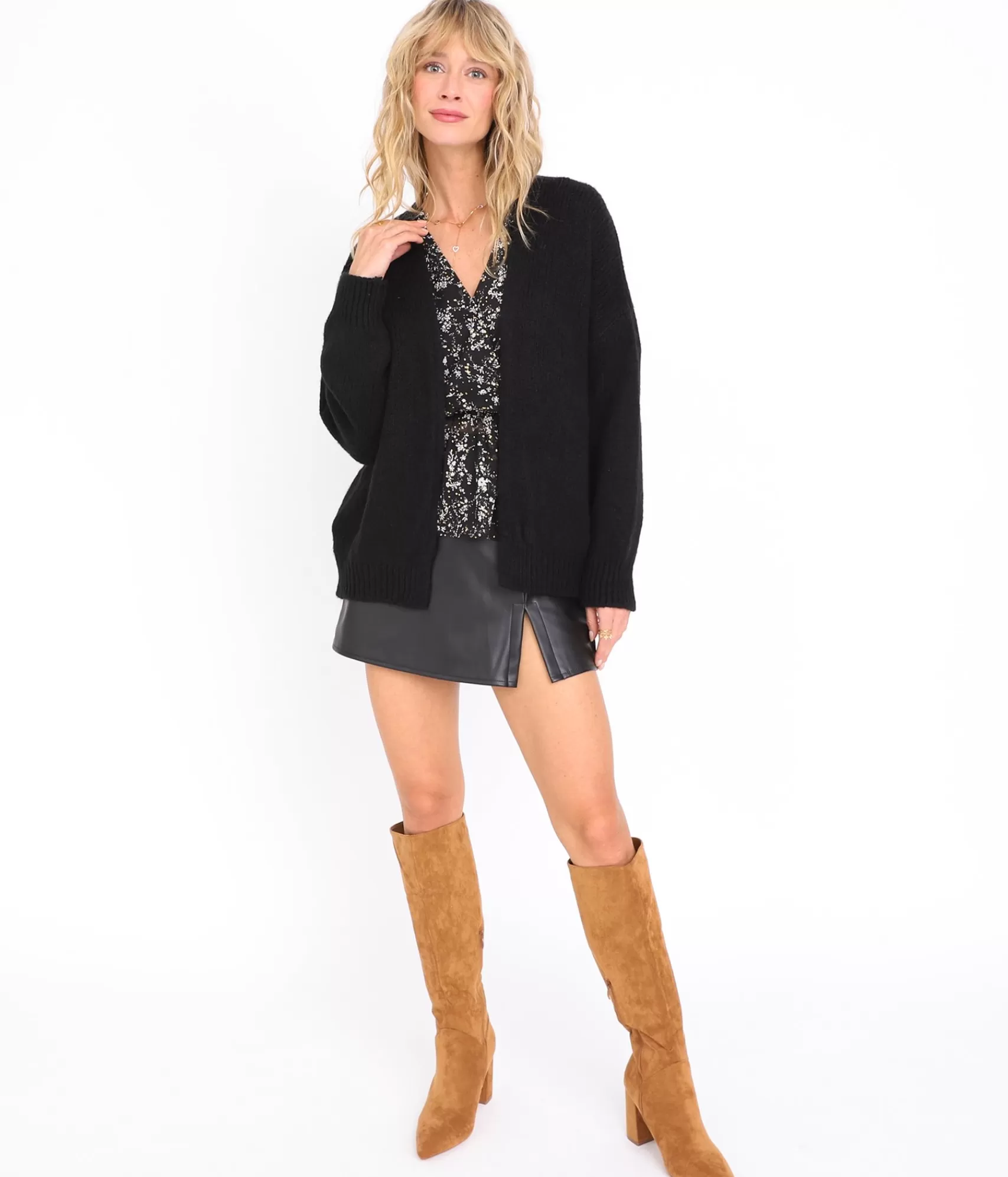 Cardigan à manches longues en tricot uni duveteux. Coupe ample. Manches longues effet bouffant montées sur emmanchures tombantes. Sans col. Sans fermeture. Coloris uni. Maille jersey chaude et duveteuse. Poignets et base tricotés en côtes. Base droite. Composition contenant de la laine.
