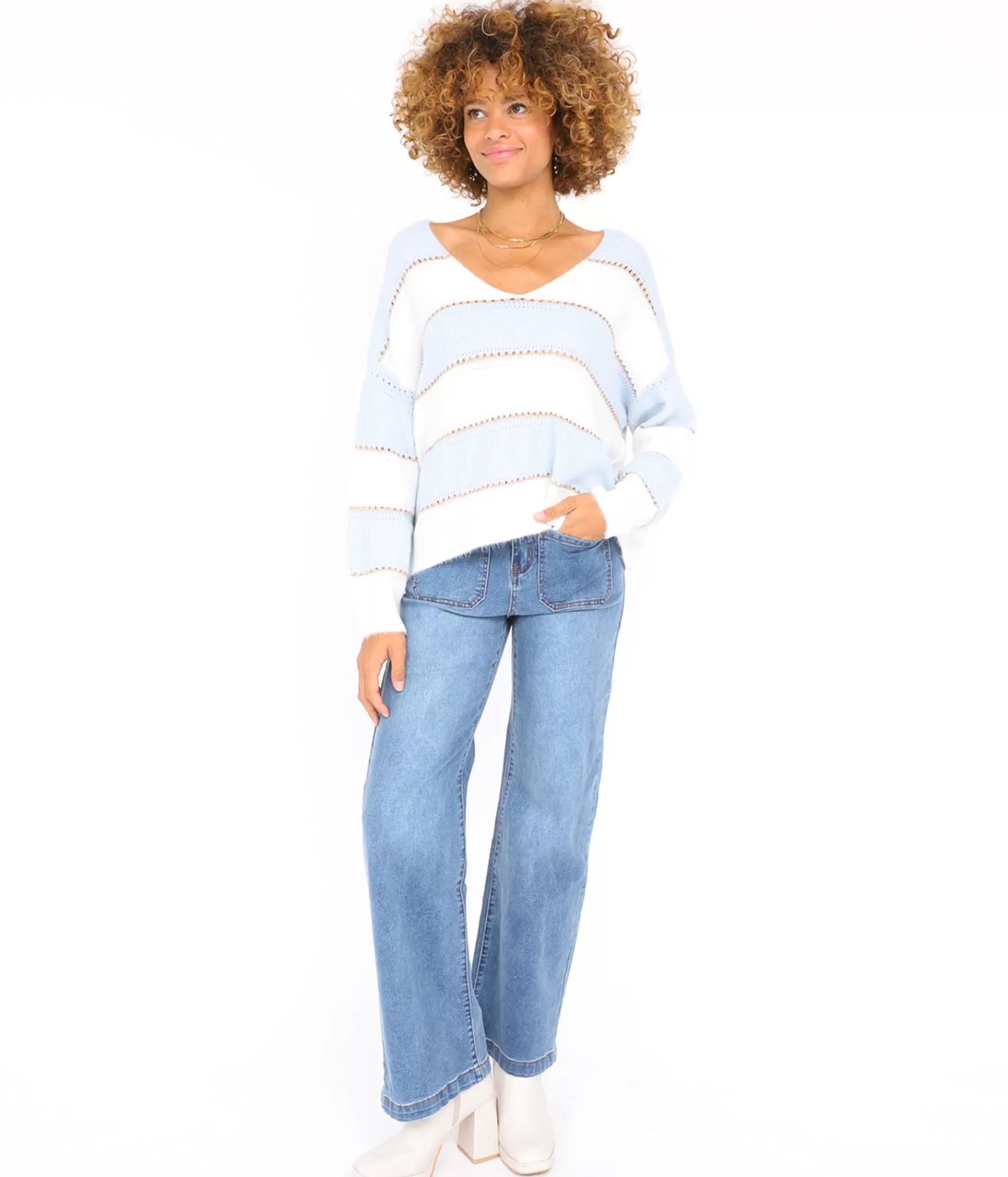 Pull ample en tricot rayé multicolore ajouré et reflets irisés. Coupe large. Manches longues. Emmanchures tombantes. Col V. Rayures bicolores horizontales délimitées par une teinte contrastée et des reflets métallisés. Maille jersey délicatement duveteuse avec ajourés placés en bordure des rayures. Finitions en côtes.